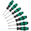 7-delige steeksleutel-schroevendraaierset van Wera. Holle schacht voor schroefwerkzaamheden aan draadeinden; immers: alleen dan kan het draadeind door de schroefmoer binnendringen in de holle schacht van de schroevendraaier. Meerdelige Kraftform-handgreep voor snel en ergonomisch schroeven. Zeskantige wegrolbescherming verhindert telkens wegrollen op de werkplek. Met greepcodering om het gereedschap sneller te kunnen vinden en sorteren. Voor buitenzeskant-schroeven.