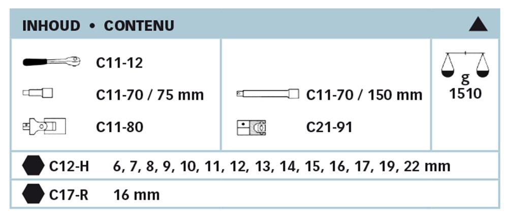 • C11-12 • C11-70 / 75 mm • C11-80 • C11-70 / 150 mm • C21-91 • C12-H : 6, 7, 8, 9, 10, 11, 12, 13, 14, 15, 16, 17, 19, 22 mm • C17-R : 16 mm