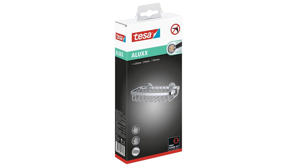 Contacteer onsHet tesa® Aluxx kleine doucherek kan dankzij het kleine formaat op vele plaatsen worden bevestigd. Zo kan je ook in een smalle douche of een kleine badkamer jouw douchespullen netjes opbergen. Het is ook een mooi accessoire om te zien, met een hoogglans verchroomde afwerking op een aluminium behuizing. Het wordt bevestigd met lijm in plaats van te boren, zodat muren of tegels onbeschadigd blijven. De lijm hardt gedurende 12 uur uit en vormt een hechte verbinding. Desondanks kan het rek snel worden verwijderd, zonder lijmresten. Eenvoudig opnieuw te gebruiken met adapter BK43-2. tesa.Power.Kit Glue: Let op! Bij gebruik kunnen gevaarlijke inhaleerbare stofdeeltjes worden gevormd. Stof niet inademen.