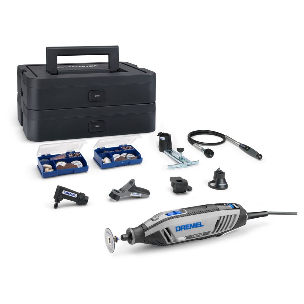 Dremel® 4250 geeft je een ultieme ervaring met onbeperkte kracht. Slijp door, snij, schuur, slijp, polijst, graveer en doe nog veel meer met deze zeer exclusieve set met de Dremel 4250. Deze set bevat 128 accessoires en 6 hulpstukken voor allerlei toepassingen en doe-het-zelfklussen. Deze set wordt geleverd in de Dremel Box, een veelzijdige opbergoplossing die aan jouw behoeften kan worden aangepast. Met verstelbare verdelers kun je het interieur eenvoudig aanpassen zodat je gereedschappen, accessoires en hulpstukken erin passen. De set bevat twee stapelbare boxen, zodat je ze veilig kunt stapelen voor ruimtebesparend opbergen of ze apart kunt gebruiken. Met de geïntegreerde handgrepen is de box eenvoudig te vervoeren, en de afneembare accessoirehouder houdt tijdens je klussen maximaal 20 accessoires die je het meeste gebruikt, binnen handbereik. Van de zwaarste klussen tot gedetailleerde creatieve klussen ondersteunt deze set je bij een groot aantal toepassingen.