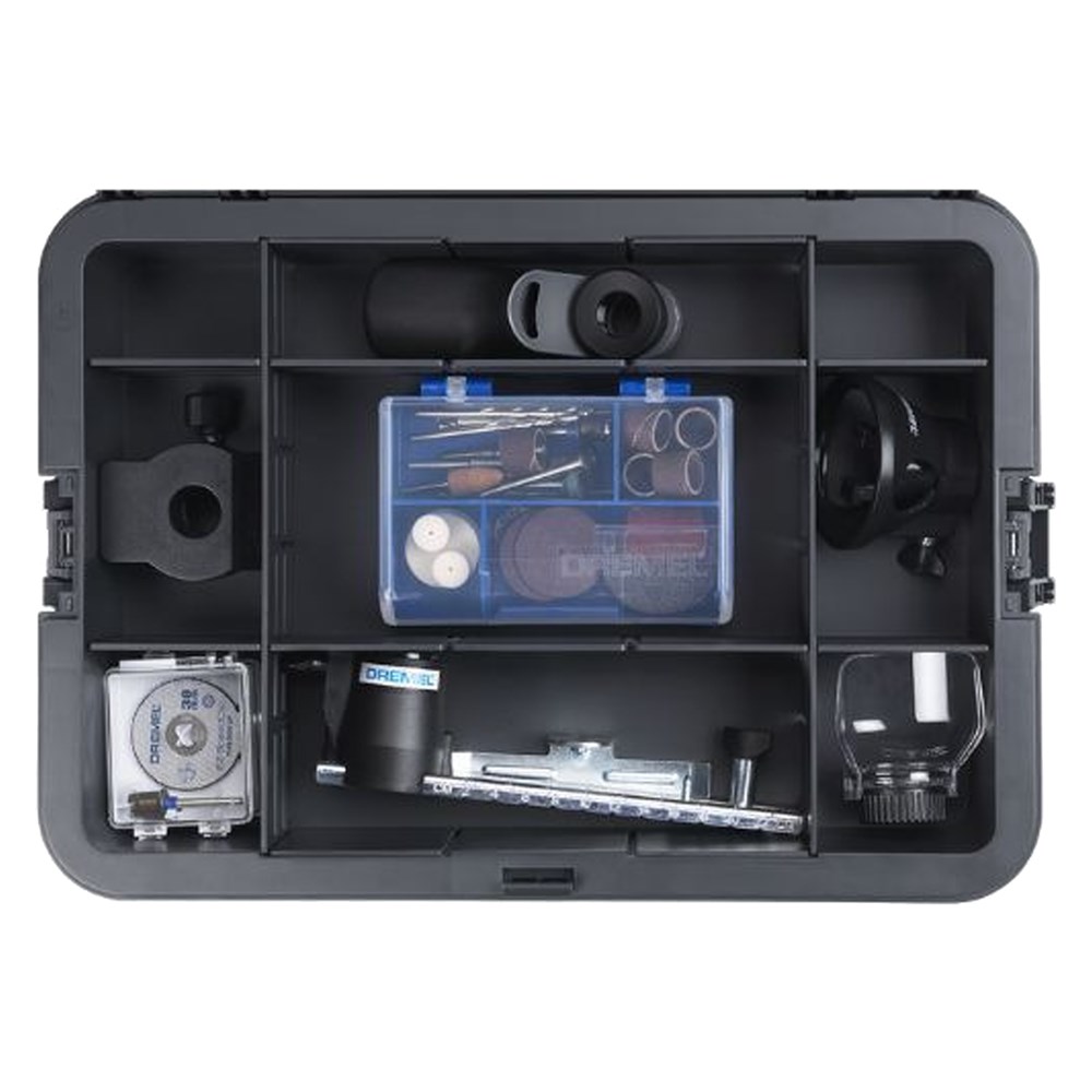 Ontketen het volledige potentieel van je gereedschap. Ontdek veelzijdige prestaties met de Dremel 8250-5/65 multigereedschapsset die 5 hulpstukken en 65 accessoires bevat voor snijden, slijpen, aanscherpen, schuren en reinigen. Precisiehulpstukken als de detailhandgreep, comfort-beschermkap en het bewerkingsplatform vergroten de controle. Met EZ SpeedClic-accessoires gaat het wisselen van gereedschappen tot wel 6 keer sneller dan met standaard accessoires. De set bevat de Dremel box die met verstelbare verdelers en twee stapelbare boxen zorgt voor een flexibele en nette opbergoplossing.
