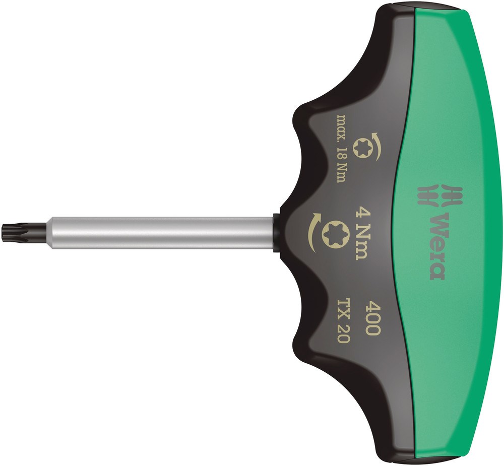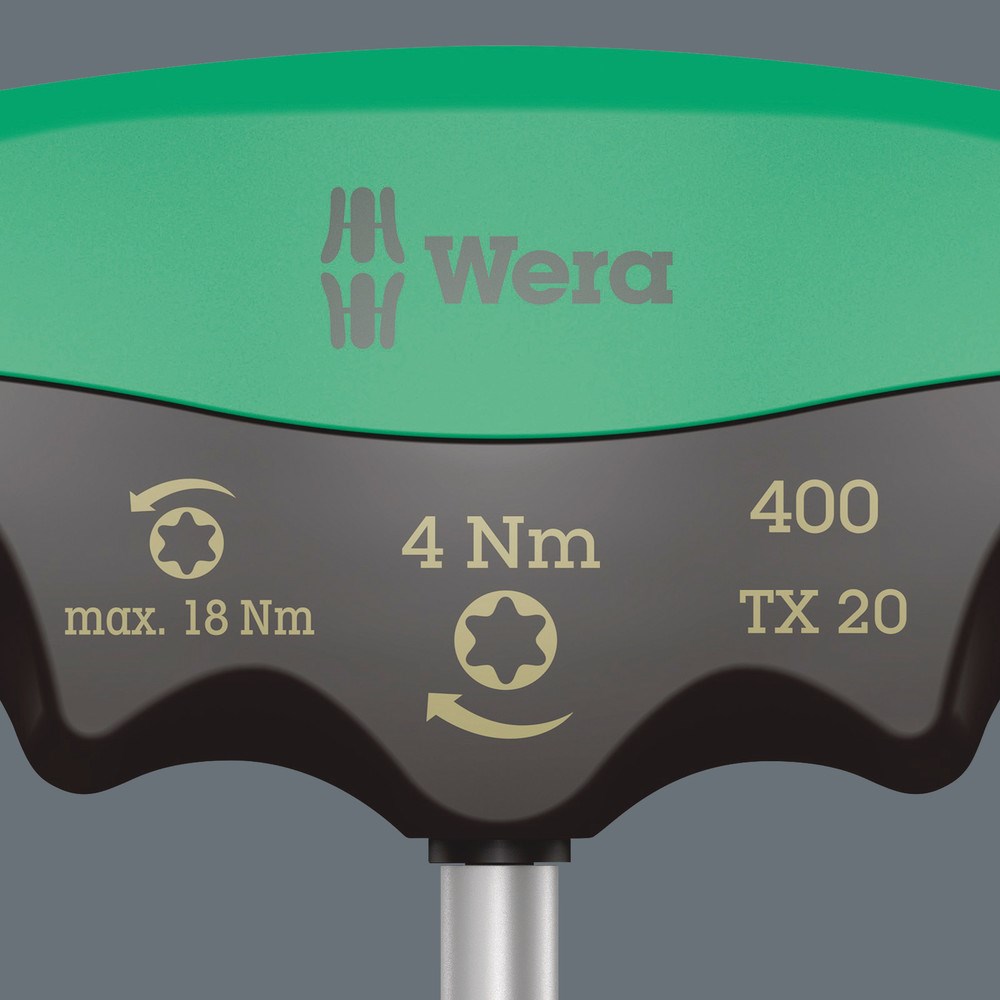 Wera draaimomentindicator met vast ingestelde draaimomentwaarde voor binnenzeskant- en TORX® schroeven. Beveiligd tegen manipulatie. De robuuste slipkoppeling staat garant voor een duidelijk hoorbaar en voelbaar signaal zodra de ingestelde draaimomentwaarde wordt bereikt; overschrijden van het draaimoment is dan ook onmogelijk. Aanzienlijk hoger losdraaimoment dan de ingestelde draaimomentwaarde, waardoor er in de meeste gevallen geen extra gereedschap vereist zal zijn voor het losdraaien van schroefverbindingen. Dankzij de vorm van de greep wordt de bal van de hand goed opgevuld en komen de vingers in de zacht afgeronde inkepingen in de greep te liggen. Daardoor is een optimale, ergonomische krachtoverdracht gewaarborgd.