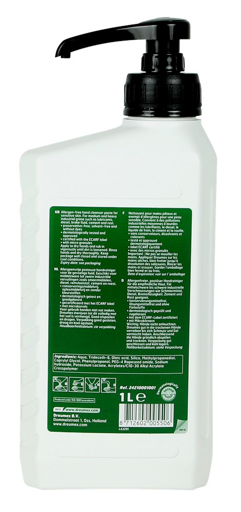 Contacteer onsDreumex Sensitive is een pasteuze handreiniger met allergeenvrije ingrediënten, en is speciaal geschikt voor de gevoelige en beschadigde huid. De handreiniger is vrij van parfum, kleurstoffen, oplosmiddel en conserveringsmiddelen. Met de toevoeging van de huideigenstof kaliumlactaat blijft de huid soepel en geconditioneerd. Door de toegevoegde microkorrels reinigt Dreumex Sensitive grondig zonder hierbij de huid te beschadigen. De krachtige handreiniger is geschikt voor middelzware tot zware industriële vervuilingen zoals smeermiddel, diesel, remvloeistof, cement en roest. Meer dan 75 miljoen mensen in Europa hebben een gevoelige huid en daarmee grote kans om een huidontsteking zoals (hand)eczeem te ontwikkelen. Van alle beroepsgeïndiceerde huidaandoeningen is 85% een vorm van contacteczeem. 30% van de werknemers in de auto-industrie heeft last van handeczeem. Dreumex Sensitive bevat daarom enkel allergeenvrije ingrediënten en geen uitlokkende factoren als conserveermiddel, oplosmiddel, kleurstof en parfum.