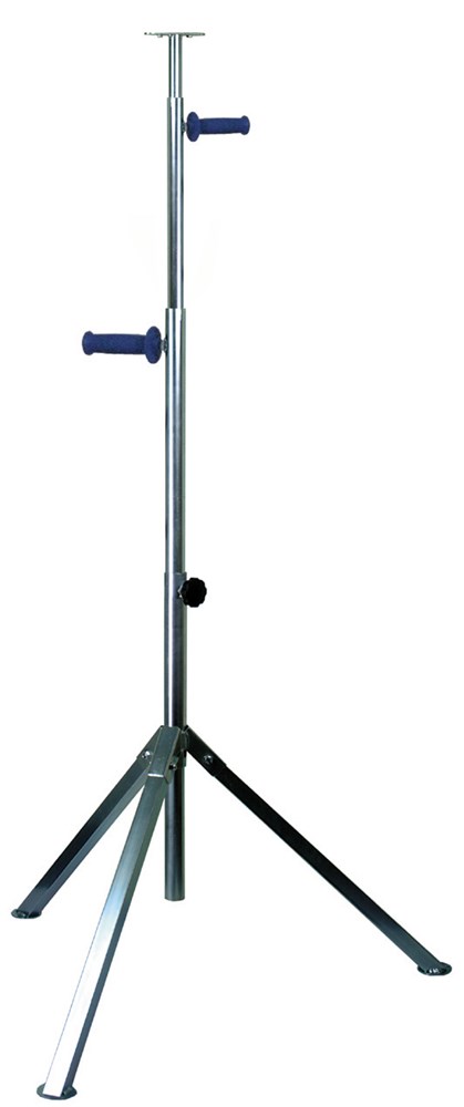 Contacteer onsDriepootstatief van verzinkt staal voor verlichtingsarmaturen, voorzien van ronde voetplaten met gat voor fixatie en met inwendige draad M10 voor het bevestigen van zwenkwielen. Inclusief bevestigsmateriaal, M8 bouten en moeren.
