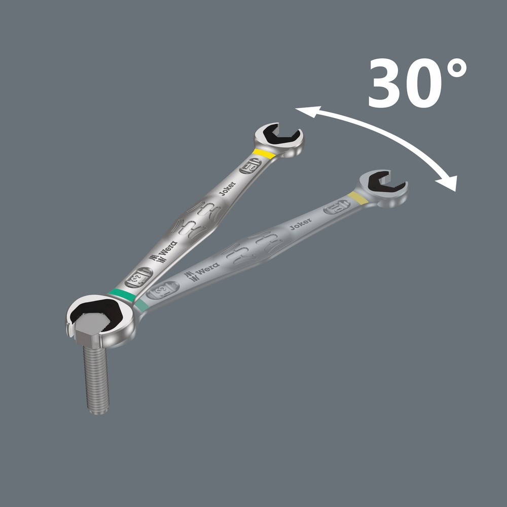 Hoogwaardige, metrische dubbele steeksleutels van Wera: Alles wat een sleutel moet kunnen. En nog veel meer. Sneller, beter, mooier. Kortom: een echte Joker. De nieuwe generatie steek/ring-ratelsleutels. Voor zeskant-schroeven resp. moeren. Met vasthoudfunctie via metalen plaat in bek, om verlies van schroeven en moeren te reduceren. De verwisselbare metalen plaat in de bek houdt met extra harde tanden schroeven en moeren en verkleint het risico op wegglijden. De geïntegreerde eindaanslag voorkomt het wegglijden naar beneden van de schroefkop en maakt hoge draaimomenten mogelijk. De intelligente dubbele zeskant-geometrie zorgt voor een sluitende verbinding met schroef of moer en reduceert zo het risico op wegglijden. Dankzij de terughaalhoek van slechts 30° behoort het tijdrovende omkeren van de sleutel tijdens het schroeven tot het verleden. De speciale smeedvorm maakt overdracht hoge draaimomenten mogelijk en geeft het geheel een hoge buigstijfheid. Gemaakt van sterk chroom-molybdeen staal met nikkel-chroom coating voor een hoge bescherming tegen corrosie. Met 'Take it easy'-Toolfinder: Kleurcodering op grootte.