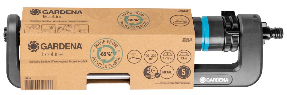 Contacteer onsDe EcoLine Zwenksproeier van GARDENA is een duurzaam ontworpen oplossing voor het nauwkeurig besproeien en irrigeren van rechthoekige oppervlaktes vanaf 90 meter tot 220 m². Het hele oppervlak wordt bewaterd, zonder dat er plassen ontstaan. Deze zwenksproeier is vervaardigd uit kunststof dat bestaat uit meer dan 65 procent materiaal gerecycled uit huishoudelijk afval. De aluminium buizen van de sproeier bevatten meer dan 25 procent gerecycled materiaal. De gebruikte metalen elementen versterken de stevigheid en duurzaamheid van de sproeier en geven hem een elegant uiterlijk. Ongeacht of het een klein of groot oppervlak is, alles wordt gelijkmatig bewaterd. De sproeier is gemakkelijk in gebruik: plaats hem daar waar je wilt sproeien, sluit hem met een tuinslang aan op de kraan en zet de kraan open. Met de schuifregelaar kun je het bereik van de sproeier vervolgens van 7 tot 17 meter aanpassen. De EcoLine sproeier heeft in de breedte een bereik van maximaal 13 meter. De sproeier is uv- en vorstbestendig; je kunt hem zonder problemen het hele jaar door buiten opbergen. De vierkante sproeier beschikt over zijn eigen snelle en slimme reinigingsfuncties. Het ingebouwde filter kan worden verwijderd en gemakkelijk onder stromend water worden schoongemaakt. Eventuele kalkaanslag kan met de reinigingsnaald worden verwijderd. Zo kunnen verstopte sproeimondjes snel worden ontstopt. De EcoLine Zwenksproeier is vervaardigd in Duitsland en GARDENA biedt hierop een fabrieksgarantie van vijf jaar.