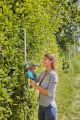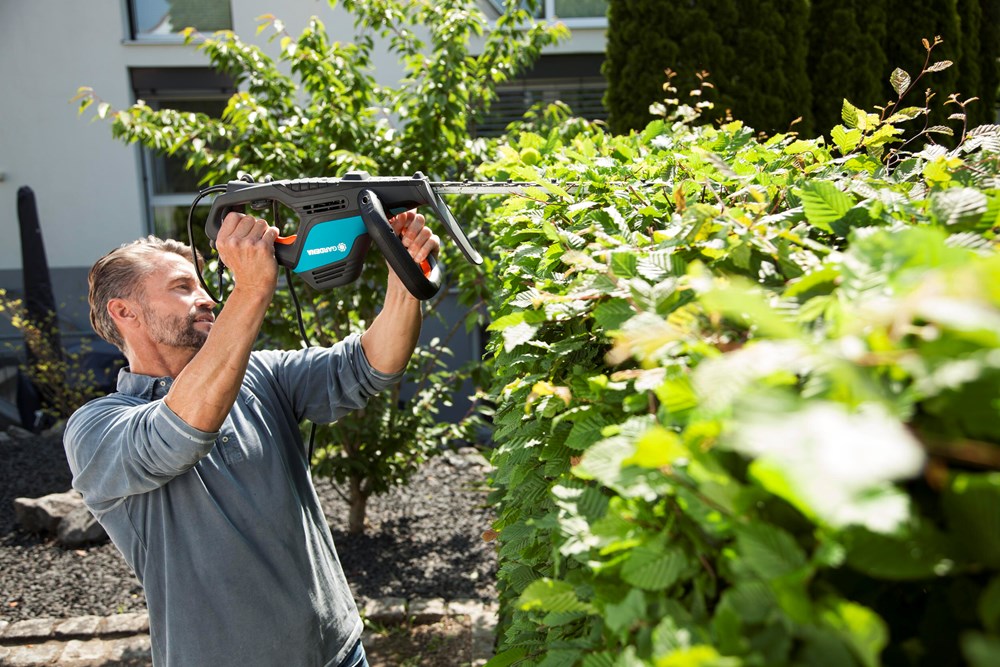Contacteer onsDe GARDENA elektrische heggenschaar ComfortCut 550/50 is ideaal om middelgrote heggen mooi te snoeien. Geen vermoeide armen De elektrische heggenschaar met lange steel weegt 3,5 kg en is lichter dan conventionele scharen. De ergonomische greep zorgt ook voor een gemakkelijk gebruik. Hij past zich aan de natuurlijke stand van de handen aan en is daarom zowel voor rechts- als linkshandigen geschikt. Ook zijdelings snoeien gaat door het gelijkmatige evenwicht van de elektrische schaar gemakkelijk. Voor bijzonder goed onderhouden heggen Het precisiemes is met een laser gesneden waardoor de elektrische heggenzaag echt professioneel tuingereedschap is. De meslengte is 50 cm voor krachtige en snelle snoeiresultaten. Zowel horizontaal als verticaal snoeien gaat gemakkelijk. Voor een maximum aan comfort zorgt de GARDENA opvangzak Cut&Collect die rechtstreeks aan het mes van de heggenschaar wordt bevestigd en het snijgoed opvangt. De heg te lijf met maximale veiligheid Struiken, heggen of struikgewas: de ergonomisch gevormde greep van de schaar zorgt dat u hem goed kunt vastpakken en veilig kunt werken. De kabeltrekontlasting voorkomt dat kabels onbedoeld los raken tijdens het snoeien. Duurzame messen die uitsekend presteren Het uiteinde van het mes heeft een stootbescherming, zodat het snoeien langs de grond of huis- en tuinmuren geen problemen oplevert. Zo kunnen perfecte snoeiresultaten worden bereikt zonder dat de messen beschadigd raken. De precisiemessen zijn bovendien robuust waardoor ze lang goed blijven. Met een opening van 27 mm tussen de tanden zorgen ze voor een snelle, efficiënte snoeibeurt van de heg zonder storende blokkeringen of onderbrekingen. In het stopcontact en aan de slag Als de elektrische heggenschaar stroom heeft, is ze klaar voor het optimale onderhoud van de tuin. Als de snoeischaar is ingestoken, hoeft u alleen nog maar de beide startknoppen in te drukken en u kunt beginnen met het snoeiwerk. De knoppen kunnen in elke positie gemakkelijk worden bediend.