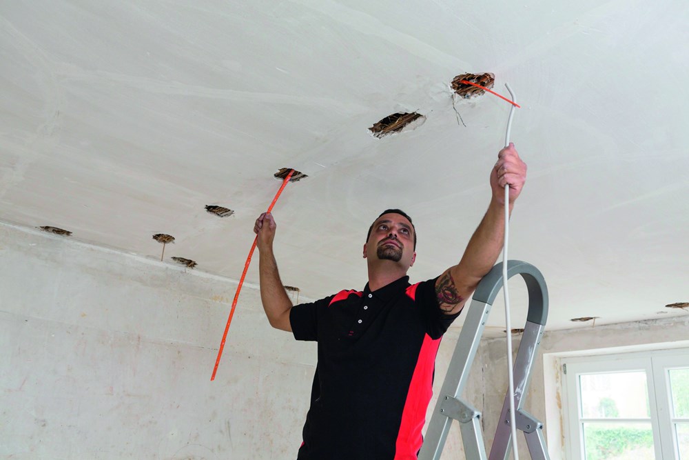 Application: Voor het uitmeten en markeren van de afstanden tussen inbouwdozen en het intrekken van kabels bij de elektrotechnische installatie.