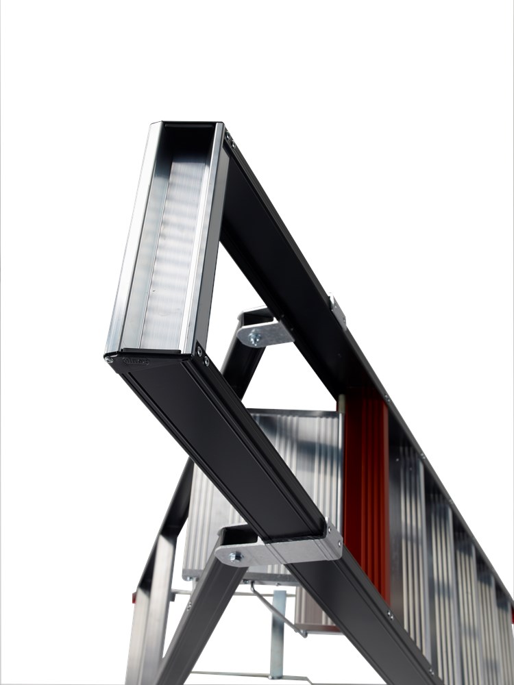Extra bijzonder zijn de twee bordessen boven elkaar. Daarmee beschik je over twee veilige en comfortabele werkplekken. Door de drukvaste spreidbeveiliging weet je zeker dat de trap niet ongewild inklapt. Bovendien sta je stevig en stabiel door de grote antislip-voeten en de omsloten scharnieren. Een trap op het hoogste niveau.