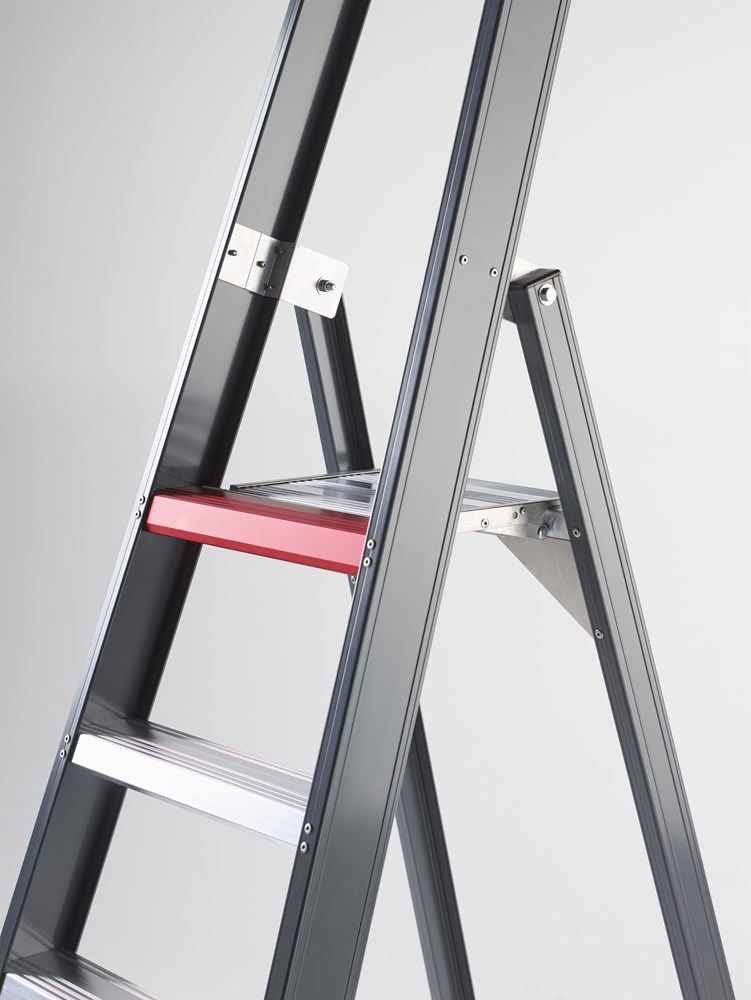 De grijze coating is niet alleen stijlvol. Het is bovendien vuilafstotend en geeft niet af aan je handen. Door de schetsschoren en grote voeten weet je zeker dat je stabiel staat. De steunbeugel is niet alleen veilig. Het bakje in de beugel geeft je ook een plek voor je gereedschap.