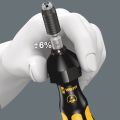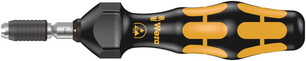 Wera draaimomentschroevendraaier. Goed beveiligd tegen elektrostatische energie en daaruit voortvloeiende schade. Variabele draaimomentinstelling, uiterst nauwkeurig. Vereist draaimoment eenvoudig instelbaar, zonder extra gereedschap. Schaalwaarde goed leesbaar. Rapidaptor-snelwisseltechnologie maakt razendsnel wisselen van bit mogelijk. Onbegrensd losdraaimoment voor het losdraaien van vastzittende schroeven. Meervoudige Kraftform-handgreep met geïntegreerde harde en zachte delen voor een hoge werksnelheid en bescherming van de handen. Geschikt voor plaatsing van bits met 1/4" buitenzeskant-aandrijving conform DIN ISO 1173-C 6,3 en E 6,3 (ISO 1173).