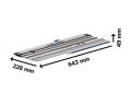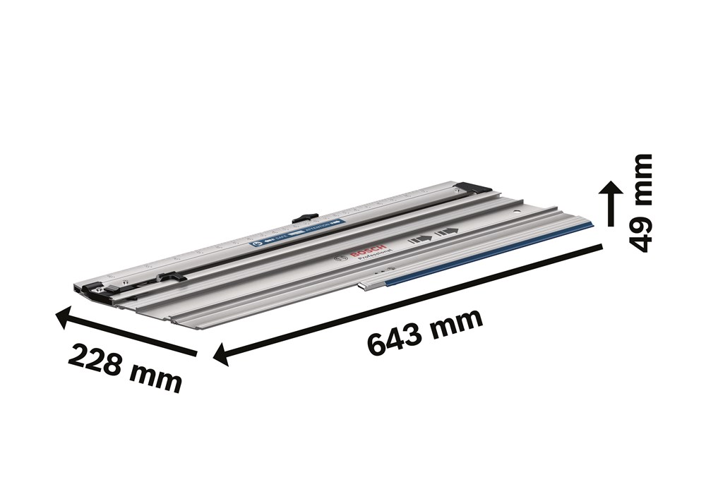 De afmetingen van de Bosch Professional afkortgeleiderail FSN 300 X zijn 436 mm, 228 mm, 49 mm.