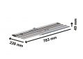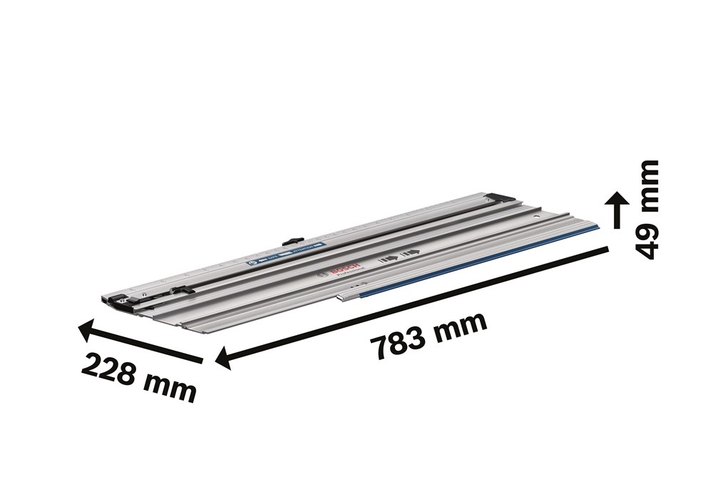De afmetingen van de Bosch Professional afkortgeleiderail FSN 440 X zijn 783 mm, 228 mm, 49 mm.