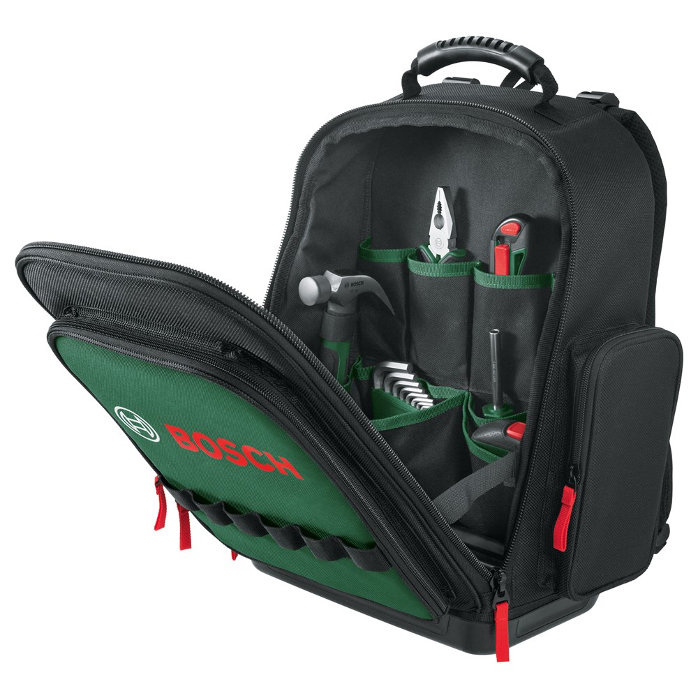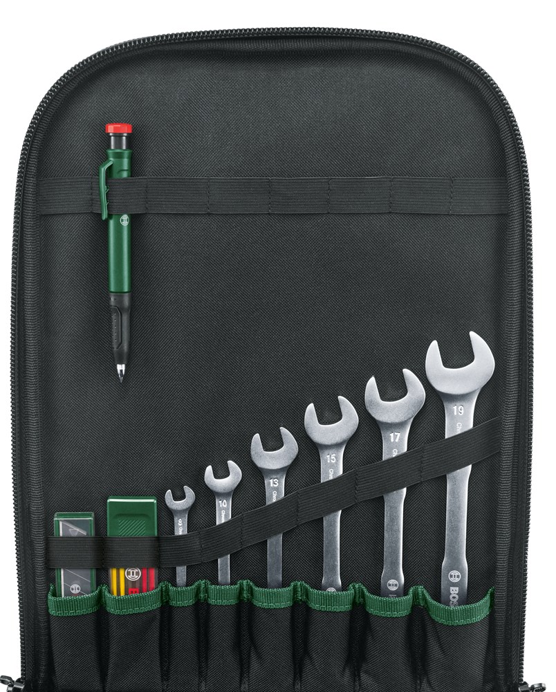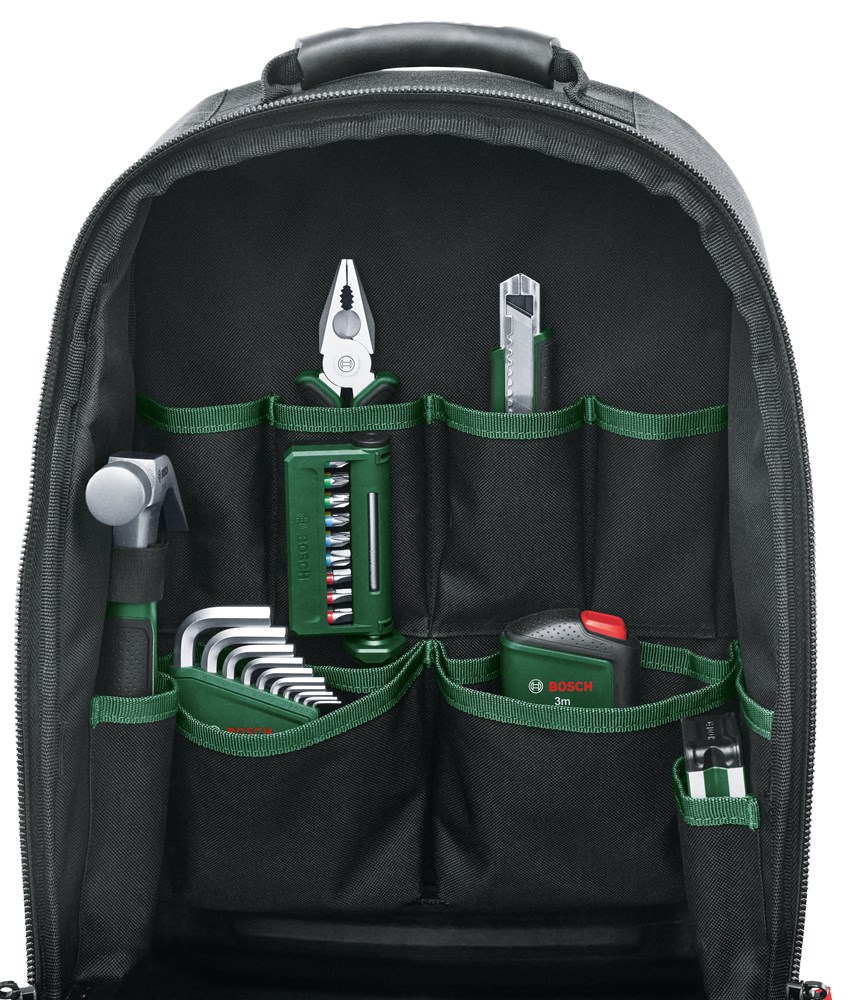 De 60-delige Bosch gereedschaps-rugzakset bevat een verscheidenheid aan handgereedschappen die nodig zijn voor doe-het-zelfklussen thuis en onderweg. Deze biedt een combinatietang van 180 mm, een bitschroevendraaier met extra bits, een handig meetlint van 3 m, een afbreekmes van 18 mm met extra mesjes, combinatiesleutels, inbussleutels, een klauwhamer van 12 oz en een waterpas van 12 cm en een diepgatmarkeerhulp met extra veelkleurige potloodvullingen voor nauwkeurige projectresultaten. Alle gereedschappen zijn gemaakt van duurzame materialen met een geavanceerd ergonomisch ontwerp en handgrepen met softgrip. De set wordt opgeborgen in de Bosch-gereedschapsrugzak gemaakt van stevige, duurzame materialen. Deze heeft een waterdichte plastic bodem met stabiele standaard, om de rugzak te beschermen tegen vocht. Dankzij verstelbare gewatteerde schouderbanden, een borstband en een gewatteerd rugpaneel is de rugzak comfortabel om te dragen. In de extra voor- en zijvakken voor persoonlijke spullen kun je alles opbergen wat je nodig hebt voor doe-het-zelfklussen.