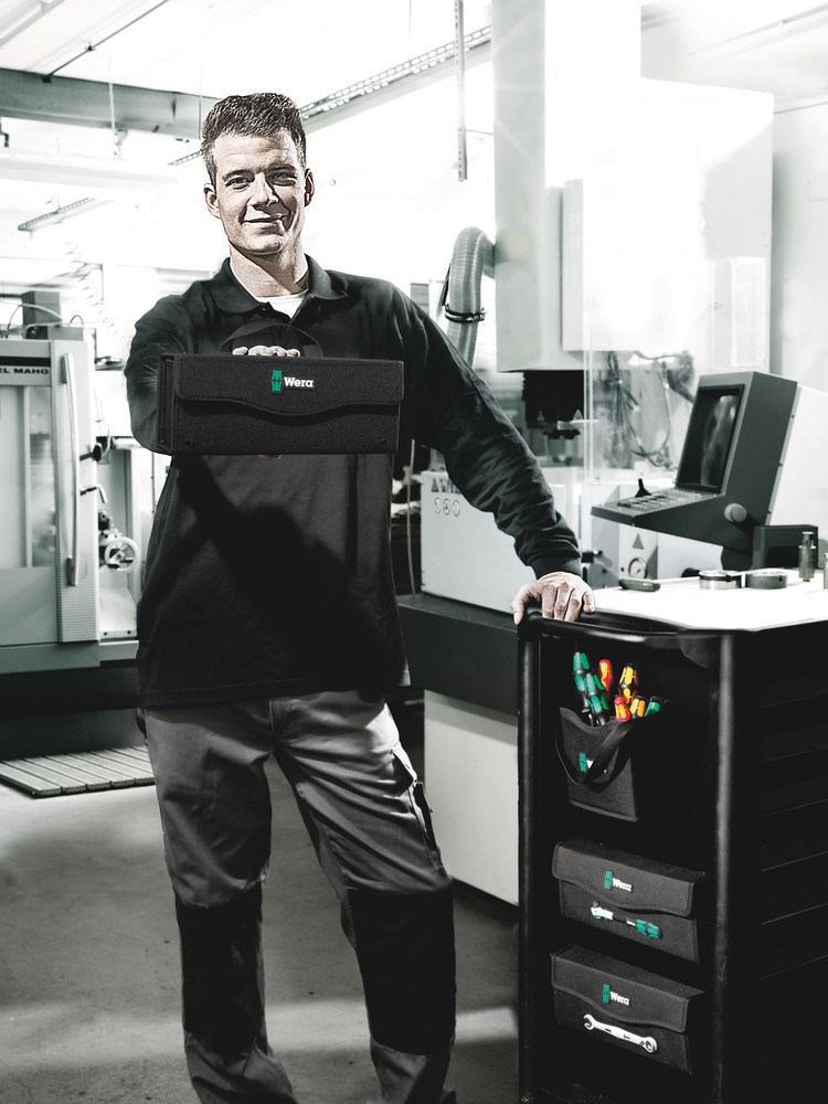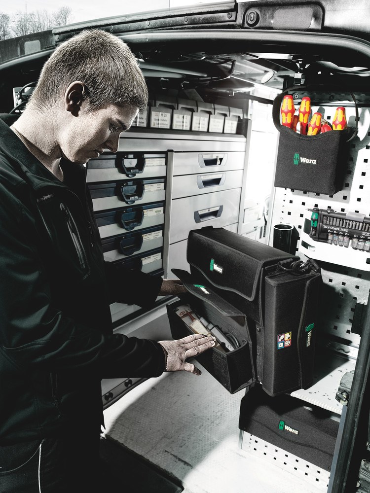 De compacte Wera 2go gereedschapsbox kan gevuld worden met gereedschap en vervangingsonderdelen en kan vervolgens aan de Wera 2go 1, 2 en 5 bevestigd worden.