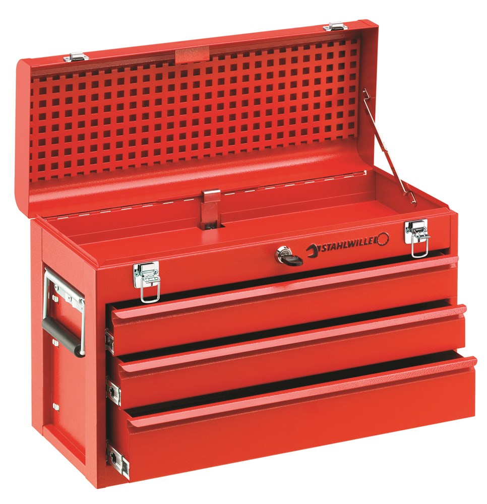 Contacteer onsMet 3 schuifladen, een vak onder het deksel (elk 449 x 55 x 185 mm), veiligheidsslot en met kunststof beklede greep bovenop het deksel. Brede, geveerde, met kunststof beklede grepen aan de zijkant. Hoogwaardig, robuust, volledig uittrekbaar glijrailsysteem. De schuifladen zijn eenvoudig uitneembaar. Individuele indeling in het deksel met veerklemmen nr. 8050.