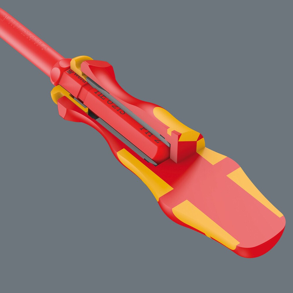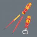 3-delige gereedschapset plus 1 flessenopener in kerstverpakking zonder reclame-opdruk. 1 Kraftform handhouder 817 VDE voor Wera Kraftform Kompakt VDE wisselklingen, 2 VDE wisselklingen (sleuf en kruiskop Phillips) met gereduceerde klingdiameter en geïntegreerde veiligheidsisolatie, om diepliggende schroeven en veerelementen te kunnen bereiken en bewerken, met "Take it easy tool finder": Met kleurcodering op profiel en ingelaserde maatcode, 1 Kraftform flessenopener.