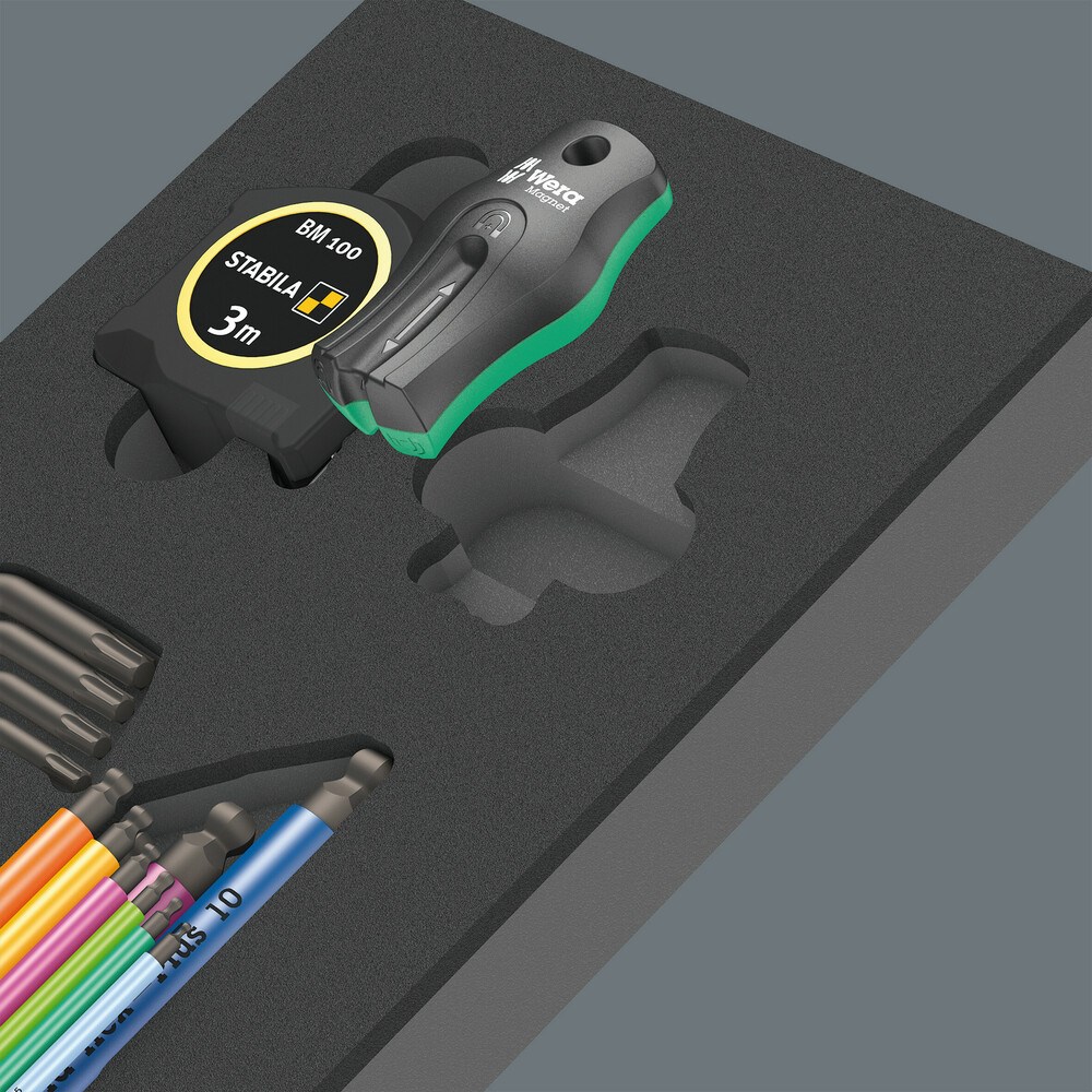 Duurzaam schuimrubberen inzetstuk; 2-kleurig om ontbrekende onderdelen snel te herkennen; geschikt voor de Tool Rebel werkplaatswagen; met 9-delige Wera stiftsleutelset 950/9 Hex-Plus Multicolour 1 voor binnenzeskantschroeven, 9-delige Wera stiftsleutelset 967/9 TX XL Multicolour 1 voor TORX® schroeven, 1 magneet 9500, 1 Stabila rolmaat (3 m).