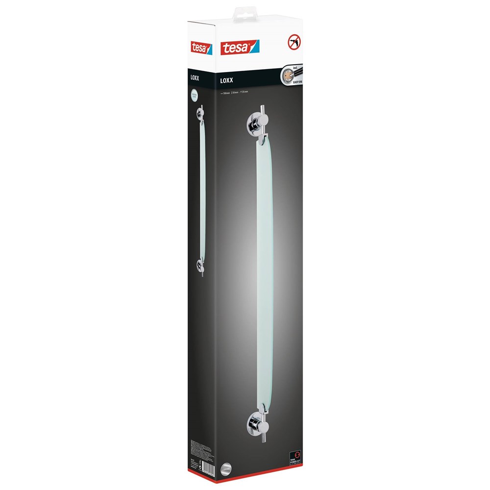 Contacteer onsHet ronde tesa® Loxx glazen wandplank bestaat uit gesatineerd glas, in een metalen drager met een hoogglans verchroomde afwerking. Het contrast tussen het glas en het glanzende metaal, samen met het prachtige algehele ontwerp, is een mooie toevoeging aan het interieur van de badkamer. Hij wordt gemonteerd met een zelfklevende oplossing die een droogtijd van 12 uur vereist. Boren is niet nodig, zodat oppervlakken niet beschadigd raken. Het planchet kan verwijderd worden zonder lijmresten. Je kunt hem ook elders ophangen met adapter BK20-2. tesa.Power.Kit Glue: Let op! Bij gebruik kunnen gevaarlijke inhaleerbare stofdeeltjes worden gevormd. Stof niet inademen.