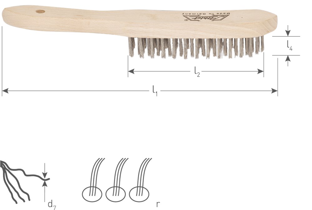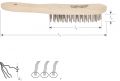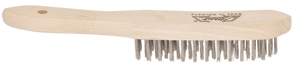 Houten handborstel voorzien van 0,3mm roestvast kwaliteitsstaaldraad.