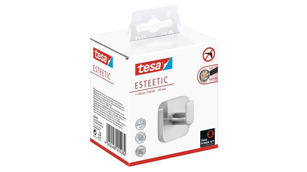 Contacteer onsHet afgeronde, vierkante ontwerp in zichtbaar in elke hoek van de fraaie tesa® Esteetic handdoekhaak. De roestvrijstalen look van het oppervlak is waterproof en roestvrij. Met zijn stevige, hoogwaardige materialen is de haak een prachtig accessoire met een lange levensduur. Deze wordt gemonteerd met een hoog draagvermogen - niet door te boren, maar met een zelfklevende oplossing. Muren en tegels lijden geen enkele schade. Hij kan snel en netjes worden verwijderd. Je kunt hem ook eenvoudigweg hergebruiken elders met adapter BK20. tesa.Power.Kit Glue: Let op! Bij gebruik kunnen gevaarlijke inhaleerbare stofdeeltjes worden gevormd. Stof niet inademen.