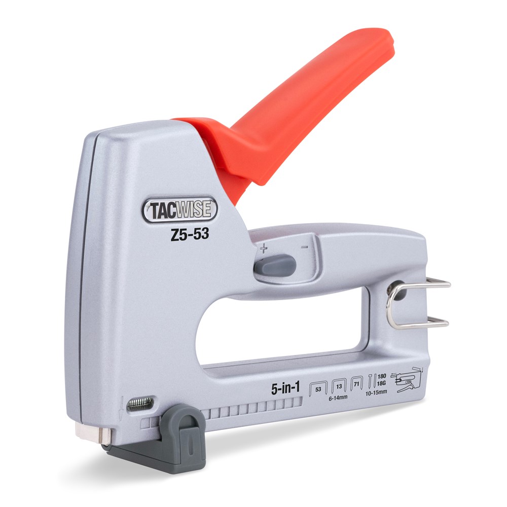 Contacteer onsHandtacker "PRO" Z5-53 / 5 in 1 5-in-1 tacker voor type 53/6-14mm nieten, 13/6-14mm nieten, 71/6-14mm nieten, 18G/10-15mm spijkers en 180/15mm koploze pennen. Lichtgewicht 0,64kg gereedschap met slagvaste aluminium behuizing en ergonomische kunststof handgreep. Volledig metalen magazijn en pro stalen chassis. Geen aanpassing nodig bij het wisselen tussen bevestigingen. Randregelaar met clip voor nauwkeurig en exact nieten. Verzonken neus.