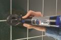 Het gebogen hulpstuk is zodanig ontworpen dat het bit behoedzaam door de voegspecie wordt getrokken – nooit geduwd. Duwen vernietigt het bit. Er zitten twee geleidepunten op het hulpstuk waarmee je het bit tussen de tegels kunt houden