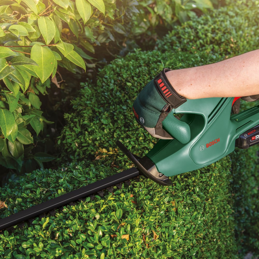 De EasyHedgeCut 18-45 is perfect voor het onderhoud en snoeien van kleine en middelgrote heggen De EasyHedgeCut 18-45 is perfect voor het onderhoud en snoeien van kleine en middelgrote heggen. Hij heeft een uitzonderlijk laag gewicht van 2,3 kg met een ergonomisch ontwerp voor comfortabel hanteren in diverse posities tijdens het werken, voor minder belasting van het bovenlichaam bij langer werken met het gereedschap. De Li-Ion-accu van 18 V levert een optimaal vermogen in combinatie met het Bosch "Anti-Blocking"-systeem om te zorgen voor uitstekende omstandigheden voor zuiver, krachtig en continu snoeien zonder frustrerende tegenslagen zoals afslaan van de motor. Snoerloze mobiliteit maakt bewegingsvrijheid in de tuin mogelijk zonder de beperking of het risico van doorsnijden van netsnoeren. Het gereedschap maakt deel uit van de POWER FOR ALL ALLIANCE. Eén accu kan een groot aantal machines/apparaten van verschillende merken laten werken.