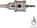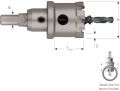 HM-dunwandige gatfrees, snijbreedte 3 mm. Daardoor tot en met diameter 100mm geschikt voor gebruik in de handboormachine. Alle modellen voorzien van een vaste adapter en verwisselbare centreerboor. Verwijder de uitwerpveer om de maximale snijdiepte te benutten. Bij dikker materiaal na elke 2-3mm lossen om de spanen te verwijderen.