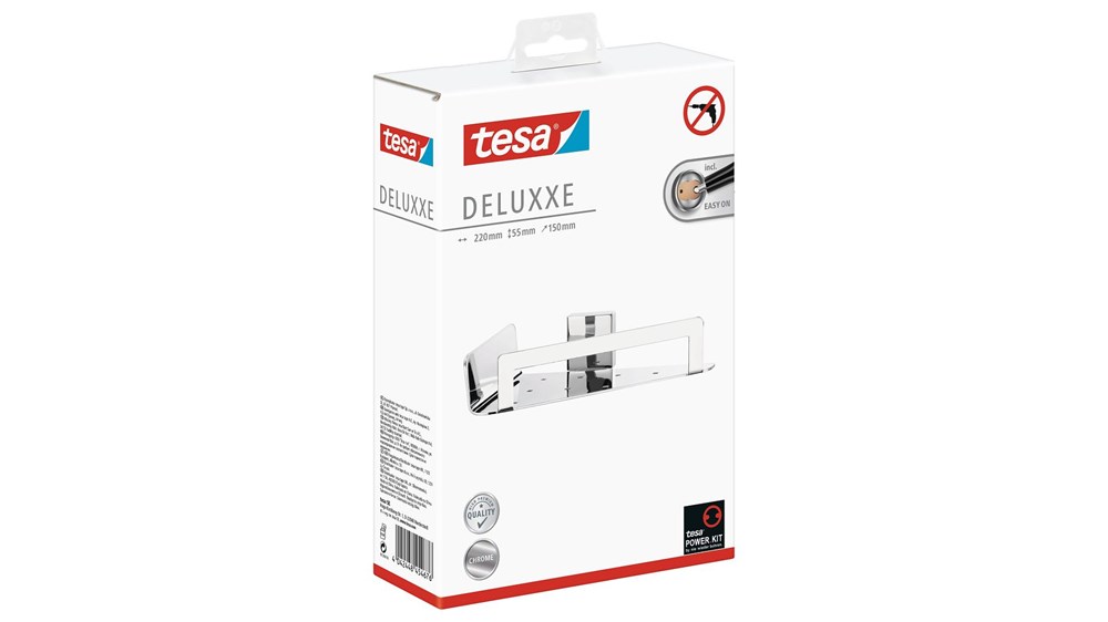 Contacteer onsZeer geschikt voor een douche - de tesa® Deluxxe hoekmand biedt een prachtige en veilige plek voor douchegels en andere toiletartikelen. De solide bodemplaat heeft verschillende afvoergaten, zodat het mandje niet vol loopt met water. De hoogwaardige materialen garanderen een lange levensduur van het mandje. De montage gebeurt met een zelfklevende oplossing die 12 uur moet drogen. Boren is niet nodig, zodat muren en tegels niet beschadigen. Het rek kan worden verwijderd zonder sporen achter te laten en elders worden geplaatst met adapter BK20. tesa.Power.Kit Glue: Let op! Bij gebruik kunnen gevaarlijke inhaleerbare stofdeeltjes worden gevormd. Stof niet inademen.