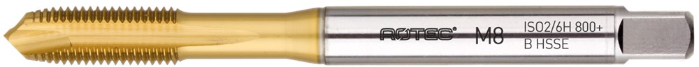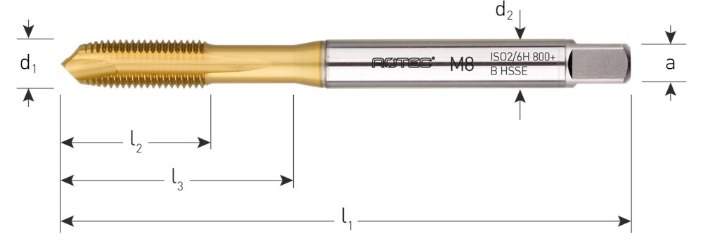 HSS-E machinetappen, DIN 371, metrisch [M], 60°, ISO2 (6H), verdikte schacht, type B met schilaansnijding, TN2-gecoat (TiAlN + TiN) voor hogere snijsnelheden en langere standtijden.