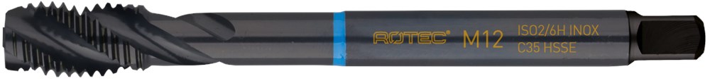 High-performance HSS-E blauwring machinetap DIN 376, metrisch [M], 60°, ISO2 (6H), dunne schacht, type C met spiraalhoek 40°.