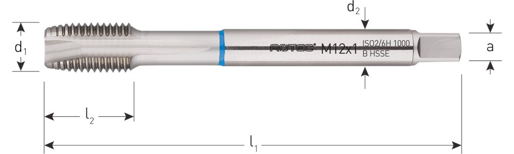 HSS-E machinetappen, DIN 374, metrisch-fijn [MF], 60°, ISO2 (6H), dunne schacht, type B met schilaansnijding.