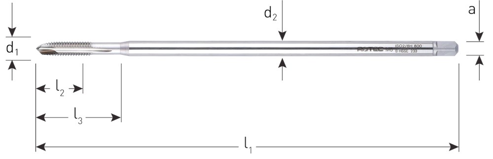HSS-E machinetappen, DIN 371-EL (t/m M6) en DIN 376-EL (M8 en groter), metrisch [M], 60°, extra lange uitvoering, type B met korte aansnijding.