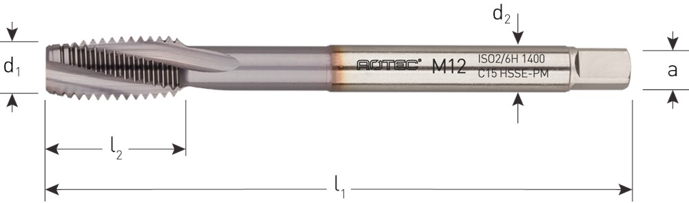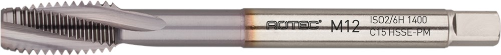 High-performance HSS-E-PM (poedermetallurgische) roodring machinetappen, DIN 376, metrisch [M], 60°, ISO2 (6H), dunne schacht, type C met spiraalhoek 15°, TiCN-coating voor langere standtijden en hogere snijcondities. PM tappen hebben een zeer hoge taaiheid bij een zeer hoge slijtvastheid.