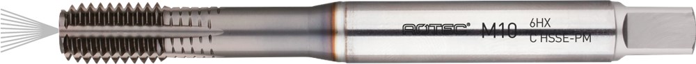High-performance HSS-E-PM (poedermetallurgische) (koelkanaal) roltappen, DIN 371, metrisch [M], 60°, ISO2 (6HX), smeergroeven, TiCN-coating voor langere standtijden en hogere snijcondities. PM roltappen hebben een zeer hoge taaiheid bij een zeer hoge slijtvastheid.