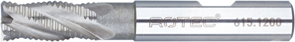 Kort model met 4 snijkanten volgens DIN 844, fijne ruwvertanding type HR, spiraalhoek 30°, cilindrische schacht met weldonvlak volgens DIN 1835-B.