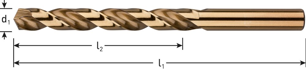 HSS-E Spiraalboor DIN 338, kort, type N, geslepen uitvoering, cobalt gelegeerd, goudkleurig, tophoek 135°, met splitpoint / kruisaanslijping (DIN 1412-C).