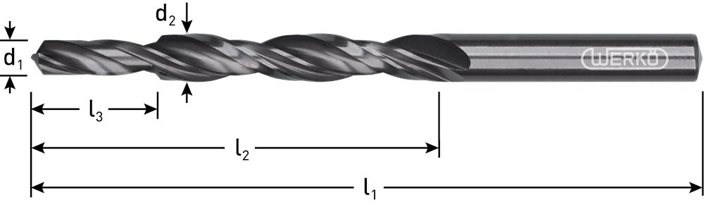 HSS meerfasenboor, kernmaten, DIN 8378, type N, overgangshoek 90°, kernpassing.