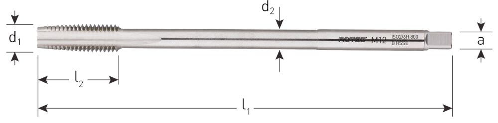 HSS machinetappen, DIN 357, metrisch [M], 60°, lange uitvoering, type B met lange aansnijding.