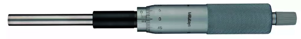 Een middelgrote, standaard, analoge Mitutoyo inbouwschroefmaat met gewone Ì÷12 mm opspanschacht en heavy-duty Ì÷8 mm spindel voorzien van vlakke hardmetalen punt. Ratel stoppen.