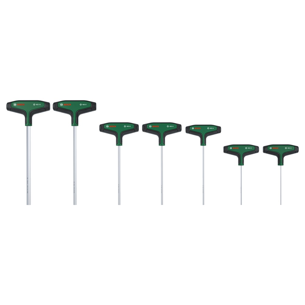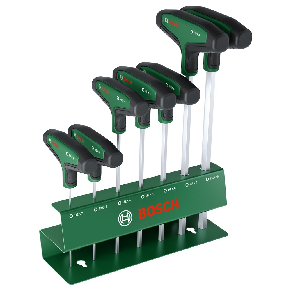 De 7-delige inbusschroevendraaierset met T-handgreep van Bosch biedt meer gemak en flexibiliteit voor het uitvoeren van klussen in en om het huis. Alle inbusschroevendraaiers met T-handgreep (HEX2, HEX3, HEX4, HEX5, HEX6, HEX8, HEX10) zijn een klasse apart voor gecontroleerd en krachtig bevestigen, zelfs op moeilijk bereikbare plaatsen, bij het monteren van meubels of het onderhoud van motoren en auto's. De ergonomische tweecomponenten T-handgrepen met grote softgripvlakken zijn ontworpen voor comfort en efficiënte krachtoverbrenging tijdens schroefklussen, zelfs wanneer een hoog koppel is vereist. Elke T-handgreepschroevendraaier heeft een eersteklas S2-stalen schacht (56 - 60 HRC). De extra lange schachten maken het gemakkelijker om nauwkeurig te werken op smalle, moeilijk bereikbare plaatsen. Dankzij de intuïtieve maataanduidingen op de handgreep is het gemakkelijk om voor elke klus de juiste schroevendraaier te kiezen. De T-handgreepschroevendraaiers worden overzichtelijk geleverd in een metalen rek dat kan staan of aan een muur kan worden gemonteerd.