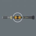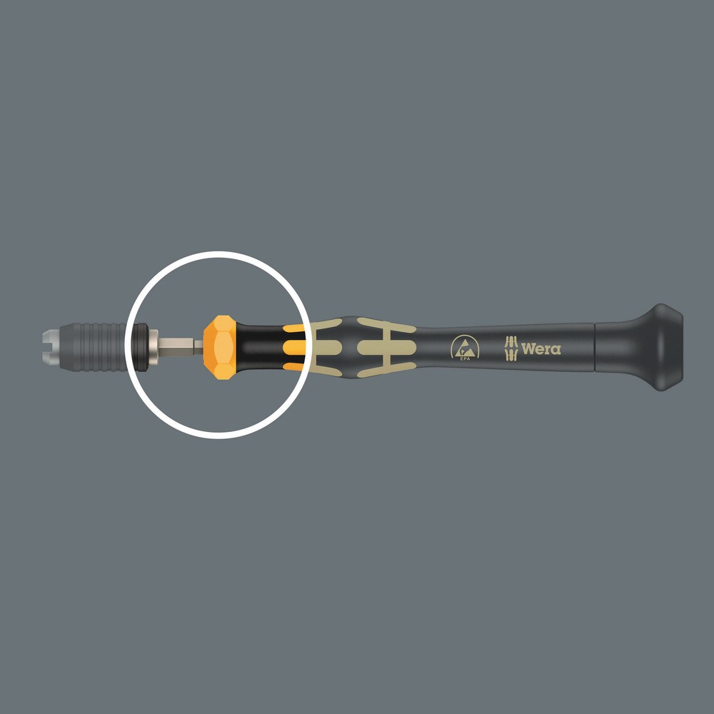 Met fabrieksinstelling op de kleinste schaalwaarde vooringesteld draaimomentwaarde. Voor alle situaties waarin constant eenzelfde draaimoment en een hoge, repeterende nauwkeurigheid vereist zijn. Het draaimoment kan met speciaal-gereedschap 05137004001 binnen het meetbereik worden veranderd. Daarna met normaal in de handel verkrijgbaar draaimomenttester de ingestelde waarde controleren. Compact handgreep/wisselkling-systeem voor precisieschroeven met vast ingesteld draaimoment. De Kraftform Micro ESD-draaimomentschroevendraaier is ideaal voor het vastdraaien met een draaimoment van elektrostatisch gevoelige componenten Geschikt voor bits met 4 mm Halfmoon-aandrijving (Wera reeks 9) en bits met 4 mm HIOS-aandrijving (Wera reeks 21). Beveiligd tegen manipulatie. Duidelijk hoor- en voelbaar doorratelen bij bereiken van het ingestelde draaimoment. Herhalingsnauwkeurig 100% gegarandeerd. Onbegrensd handmatig losdraaimoment. Elektrische oppervlakteweerstand ≤ 10^9 Ohm voor goede beveiliging tegen elektrostatische energie. Wordt geproduceerd conform DIN EN 61340-5-1. Handgreep/wisselkling-systeem voor snel wisselen van de kling. Met Kraftform Micro-handgreep met draaibare kap en sneldraaizone voor snel draaien - geen tijdrovend ompakken meer nodig. Krachtzone met geïntegreerde zachte delen voor overdracht van hoge losdraai- en aanhaalmomenten. Precisiezone direct boven kling voor de juiste draaihoek bij instelwerkzaamheden. Razendsnelle bit-bevestiging: Bit in houder schuiven, wordt automatisch vergrendeld, veilige bevestiging. Voor het vervangen van bits eenvoudig de houder naar voren schuiven en bit uitnemen. Vrijlopende huls voor eenvoudig geleiden van gereedschap tijdens het schroeven. Bits geschikt voor hand- en machineschroefbewegingen (o.a. HIOS, Delvo, Sehan). Ideaal voor gebruik bijvoorbeeld bij smartphones, mobiele telefoons, camera's, elektronische apparatuur, in tandtechnische laboratoria en tandartspraktijken.
