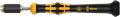 Met fabrieksinstelling op de kleinste schaalwaarde vooringesteld draaimomentwaarde. Voor alle situaties waarin constant eenzelfde draaimoment en een hoge, repeterende nauwkeurigheid vereist zijn. Het draaimoment kan met speciaal-gereedschap 05137004001 binnen het meetbereik worden veranderd. Daarna met normaal in de handel verkrijgbaar draaimomenttester de ingestelde waarde controleren. Compact handgreep/wisselkling-systeem voor precisieschroeven met vast ingesteld draaimoment. De Kraftform Micro ESD-draaimomentschroevendraaier is ideaal voor het vastdraaien met een draaimoment van elektrostatisch gevoelige componenten Geschikt voor bits met 4 mm Halfmoon-aandrijving (Wera reeks 9) en bits met 4 mm HIOS-aandrijving (Wera reeks 21). Beveiligd tegen manipulatie. Duidelijk hoor- en voelbaar doorratelen bij bereiken van het ingestelde draaimoment. Herhalingsnauwkeurig 100% gegarandeerd. Onbegrensd handmatig losdraaimoment. Elektrische oppervlakteweerstand ≤ 10^9 Ohm voor goede beveiliging tegen elektrostatische energie. Wordt geproduceerd conform DIN EN 61340-5-1. Handgreep/wisselkling-systeem voor snel wisselen van de kling. Met Kraftform Micro-handgreep met draaibare kap en sneldraaizone voor snel draaien - geen tijdrovend ompakken meer nodig. Krachtzone met geïntegreerde zachte delen voor overdracht van hoge losdraai- en aanhaalmomenten. Precisiezone direct boven kling voor de juiste draaihoek bij instelwerkzaamheden. Razendsnelle bit-bevestiging: Bit in houder schuiven, wordt automatisch vergrendeld, veilige bevestiging. Voor het vervangen van bits eenvoudig de houder naar voren schuiven en bit uitnemen. Vrijlopende huls voor eenvoudig geleiden van gereedschap tijdens het schroeven. Bits geschikt voor hand- en machineschroefbewegingen (o.a. HIOS, Delvo, Sehan). Ideaal voor gebruik bijvoorbeeld bij smartphones, mobiele telefoons, camera's, elektronische apparatuur, in tandtechnische laboratoria en tandartspraktijken.