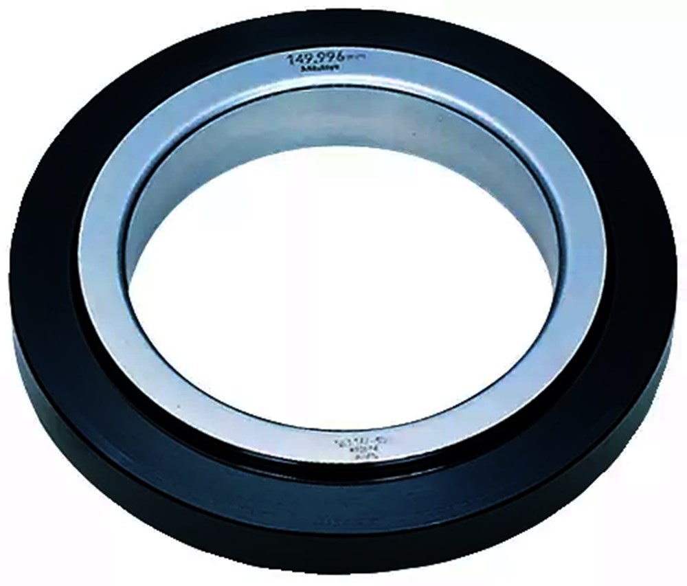 Een Mitutoyo stalen instelring voor het snel en nauwkeurig instellen van meetklokken, Holtest-meters en binnenmicrometers. De werkelijke kalibratiewaarde voor de diameter is op elke ring gemarkeerd.
