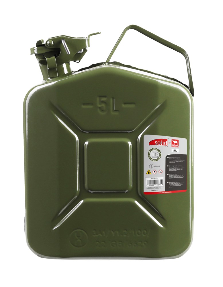 Contacteer onsSOLID Artikelnummer: PPDR 11233 JERRYCAN 5L - METAAL - MET VEILIGHEIDSSLOT. UN-GEKEURD VOOR BENZINE (E