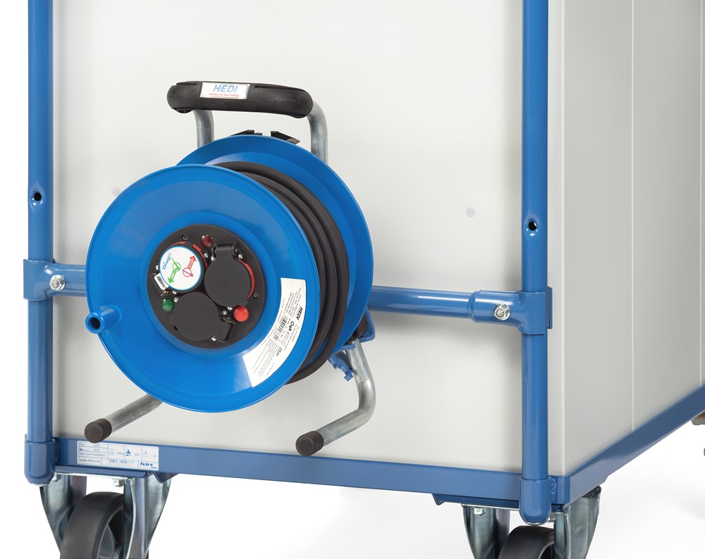 Contacteer onsKabelhaspel als aanbouwset voor MultiVario tafelwagens. Gepoedercoat blauw RAL 5007. Eenvoudige montage door middel van klemmen op de steunbuizen van de wagen. Volgens VDE met thermische beveiliging. Ook voor vochtige ruimten. Kabellengte 25 mtr, rubber kabel 3 x 1,5. Afsluitbaar door hangslot (niet bij levering inbegrepen).
