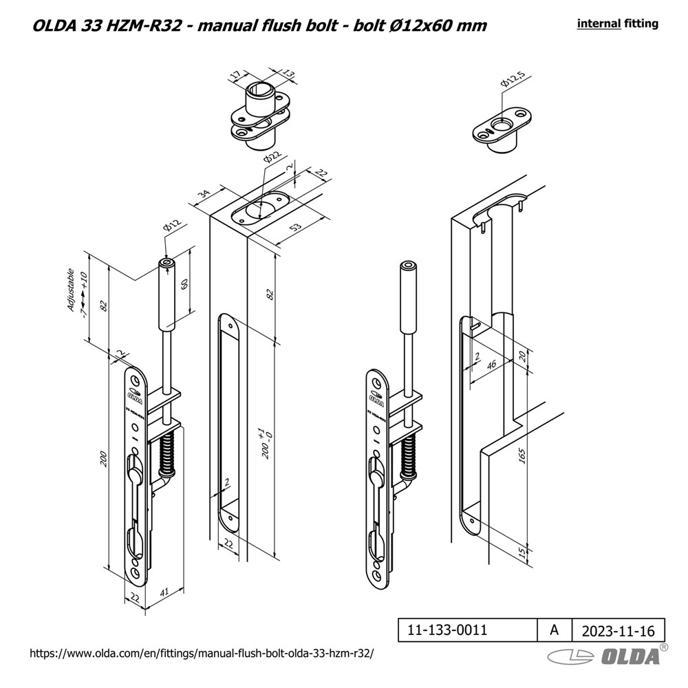 Deze manuele kantschuif is gemaakt van elektrolytisch verzinkt staal en voor houten, stalen of aluminium deuren verkrijgbaar met schoot Ø8, Ø10 of Ø12. De standaard schootuitslag van 18 mm is met een 3 mm inbussleutel -7 tot +10 mm verstelbaar is, zodat in elke situatie de ideale schootuitslag kan worden bereikt.