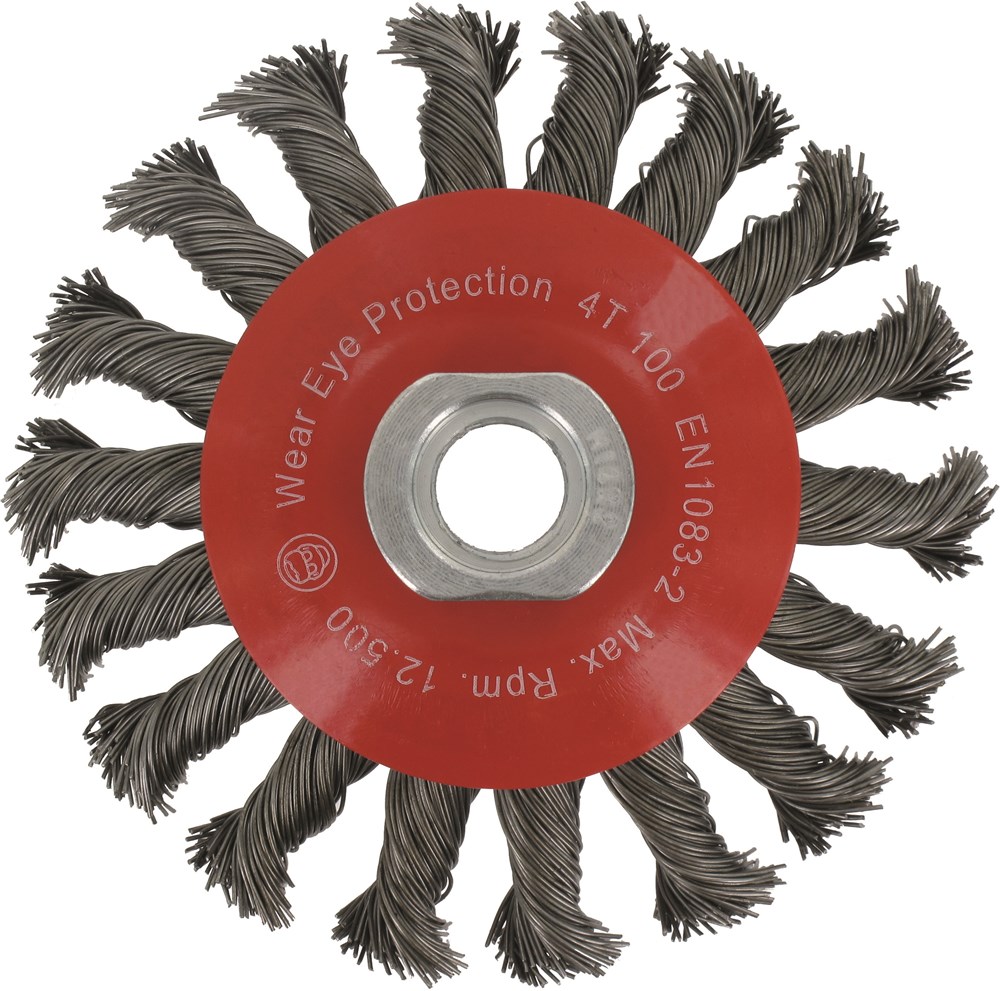 Kegelborstel voorzien van gehard, recht, kwaliteits staaldraad, getordeerd.