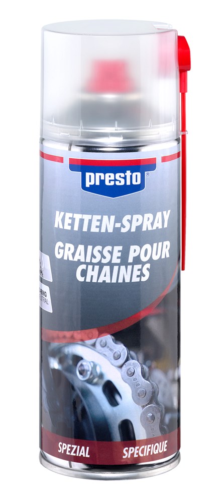 Contacteer onspresto Kettingspray biedt een unieke combinatie voor een langdurige smerende werking voor all door kettingen aangedreven transportmiddelen en machines. Het smeermiddel heeft een goede aanhechting en is daardoor geschikt voor swel bewegende en zwaar belaste kettingen zoals die in motoren. Daarnaast is het dilatant (tegengesteld van thixotropisch) waardoor het voorkomt dat olie van de ketting druipt, zelfs bij hoge snelheden.